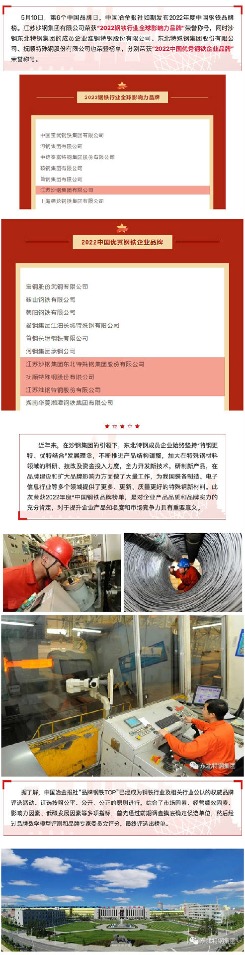 沙鋼東北特鋼集團(tuán)榮登2022中國鋼鐵品牌榜單